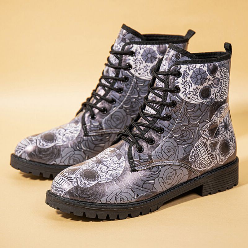 Miehet Nahka Halloween Retro Kukkainen Pääkallokuvio Paksupohjaiset Nauhanauhat Pehmeät Mukavat Rento Martinsaappaat