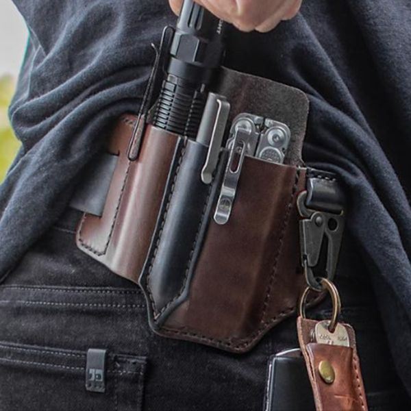 Miesten Aito Nahka Monitoimi Taskulamppu Key Pen Järjestäjä Vaimennus Vyölaukku