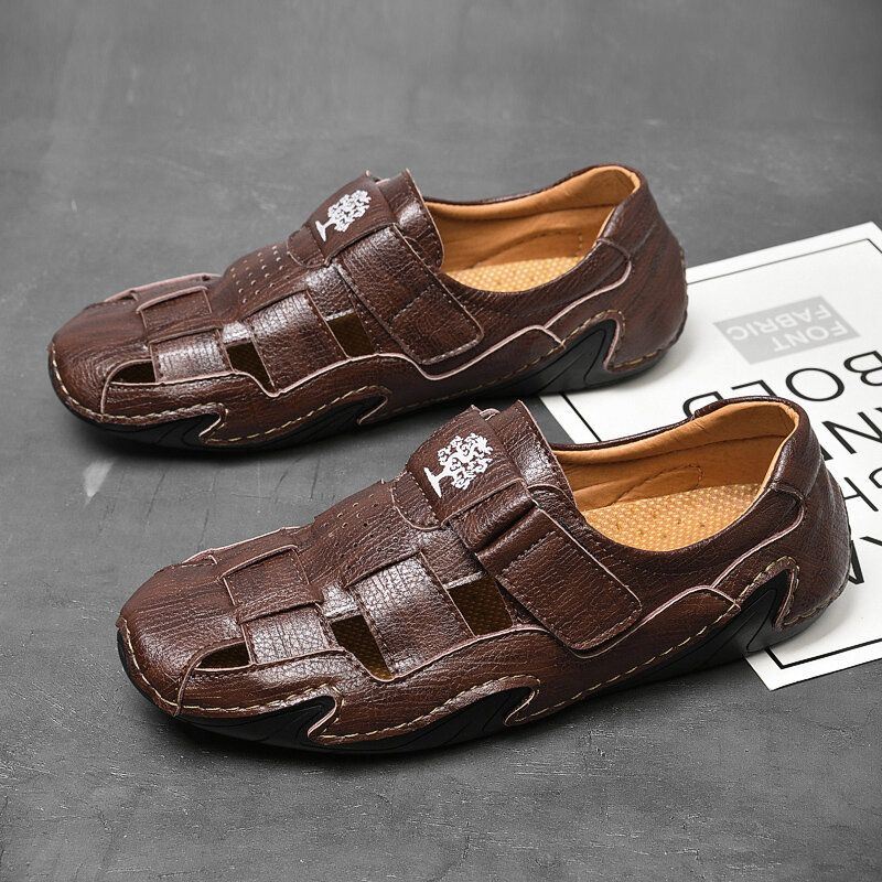 Miesten Kudotut Koukkusilmukat Käsin Ommeltavat Nahkasandaalit