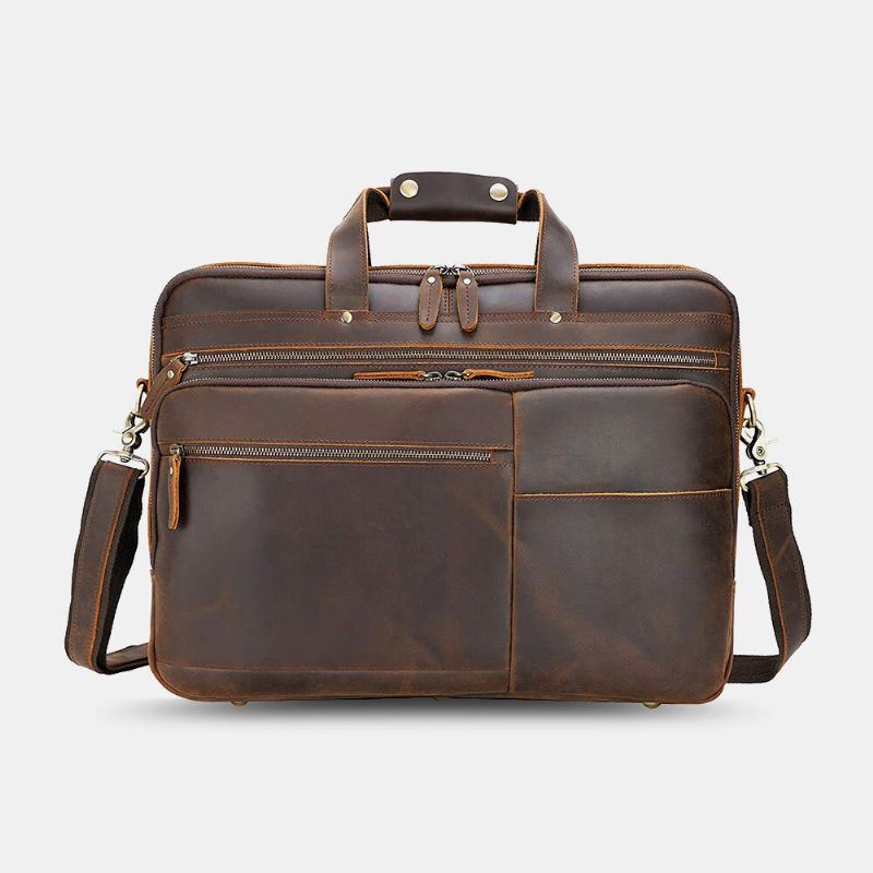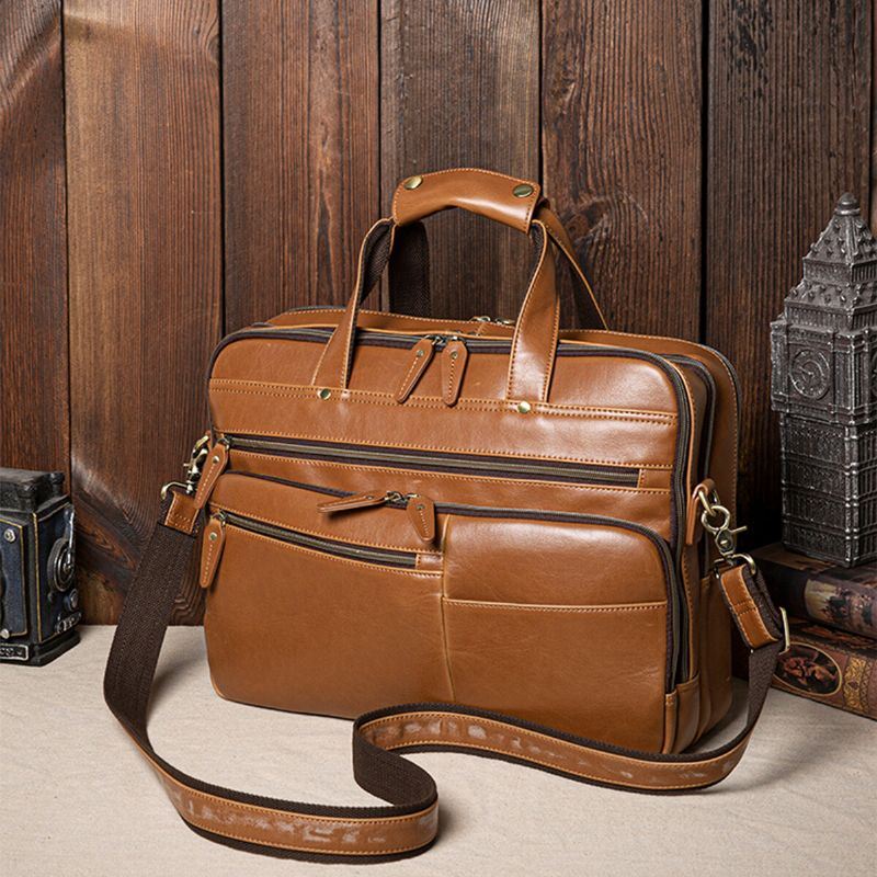 Ominaisuudet:1. Suuri nahkasalkku Versio: Mukana 3 suurta lokeroa ja erilaisia taskuja tietokoneen lisäosien, tiedostojen, muistiinpanojen, kynien ja muiden toimistotarvikkeiden erottamiseen. Kannettavan tietokoneen lokero sopii paremmin 14 tuuman kannettavaan tietokoneeseen. Takana olevan matkatavarahihnan avulla voit sitoa salkkusi tiukasti matkatavaroihin.
