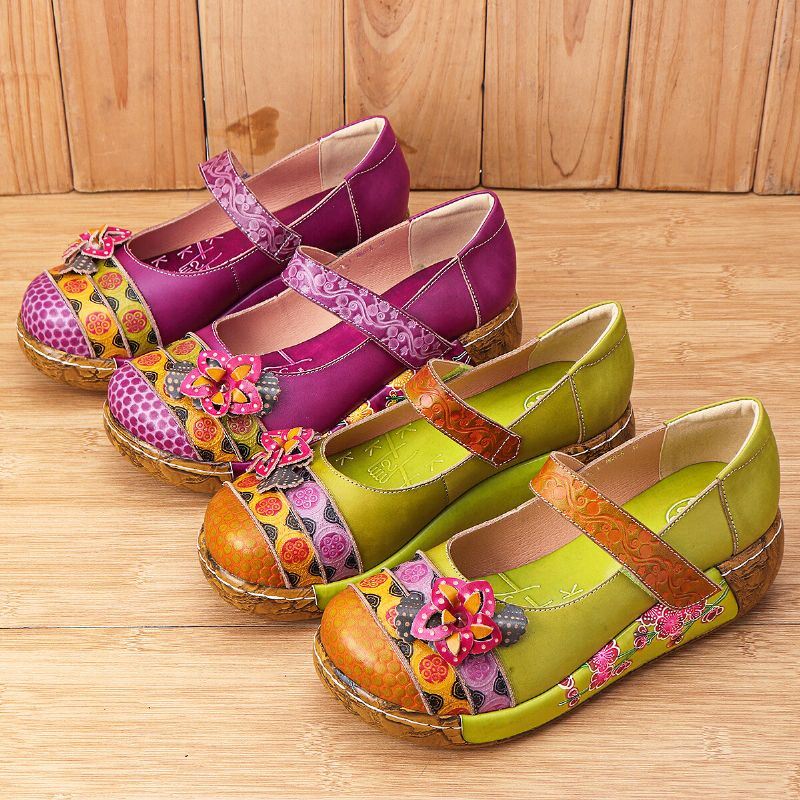 Naisten Aitoa Nahkaa Folkways Vintage Flowers Hook Loop Summer Platform Wedge Sandaalit