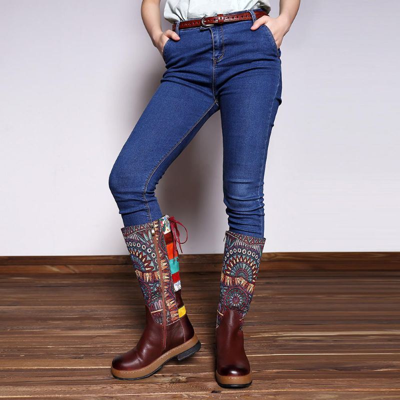 Naisten Brodeeroidut Kengänliitoskuvioiset Tasaiset Nahkaiset Polvisaappaat
