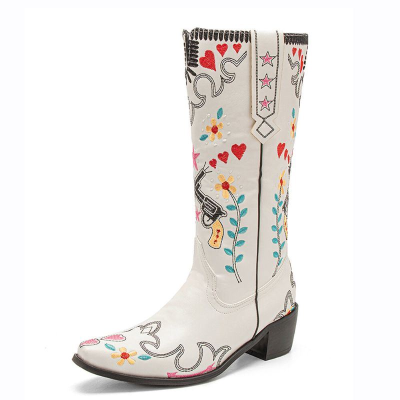 Naisten Kukkainen Makea Kirjonta Nahka Teräväkärkinen Paksu Korko Pohkeen Puolivälissä Ritarisaappaat