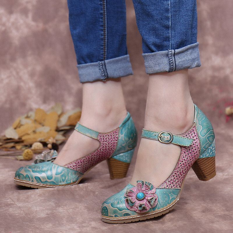 Naisten Kukkainen Nahkasolki Nilkkahihna Paksu Kantapääpumput Mary Jane -mekkokengät