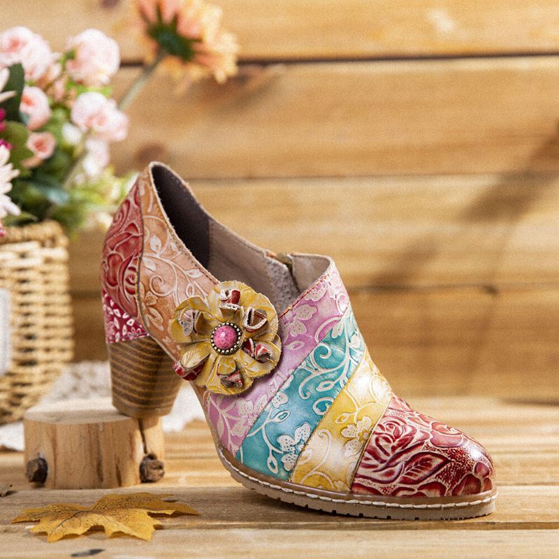 Naisten Retro Kukkainen Nahka Jatkovetoketju Paksu Heel Pumps Mekkokengät
