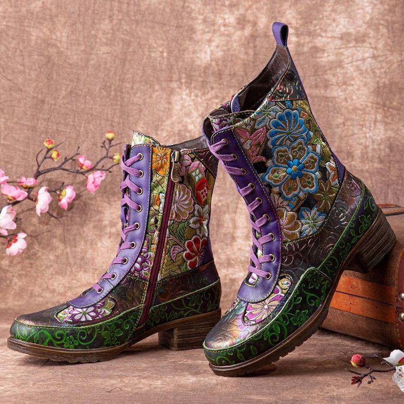 Naisten Retro Kukkakirjonta Painonahka Mukavat Paksut Korkokengät Pohkeen Puolivälissä