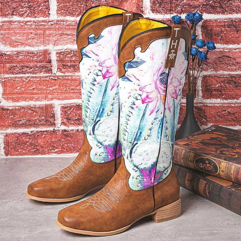 Naisten Retro-kukkakuvioiset Neliönvarvassuojattavat Cowboysaappaat