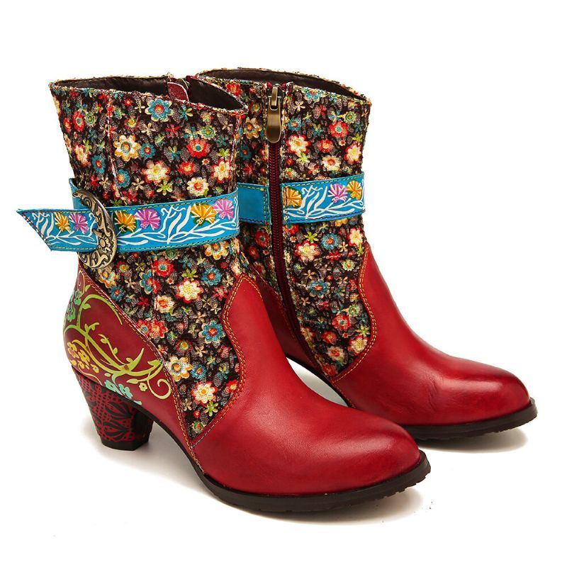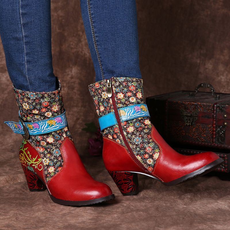 Naisten Retro-kukkakuvioiset Ompeleet Aitoa Nahkaa Metallisolkivetoketjulla Korkeakorkoiset Pohkeen Keskiosasaappaat