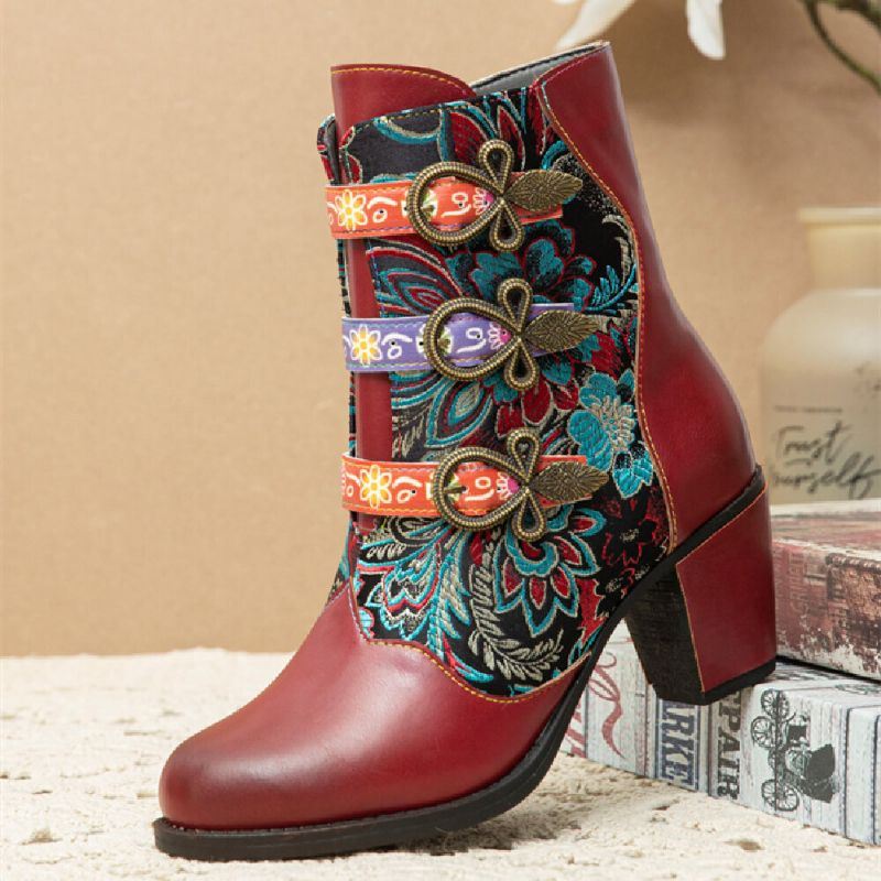 Naisten Retro-kukkia Kangasompeleet Metallisolki Decor Lämmin Vuoratut Puettavat Paksukorkoiset Lyhyet Saappaat