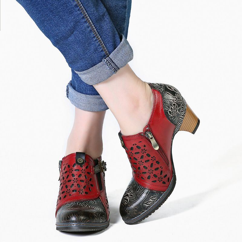 Naisten Retrokohokuvioidut Aitoa Nahkaa Yhdistävät Ontot Vetoketjut Paksut Kantapääpumput