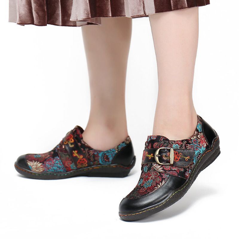Naisten Retrokukat Brodeerattu Nahka Kohokuvioitu Luumukukka Solki Litteissä Kengissä