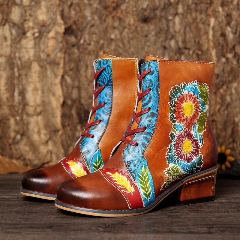 Naisten Retrokukkakuvioiset Kohokuvioidut Aitoa Nahkaa Tikkaavat Litteät Lyhyet Saappaat