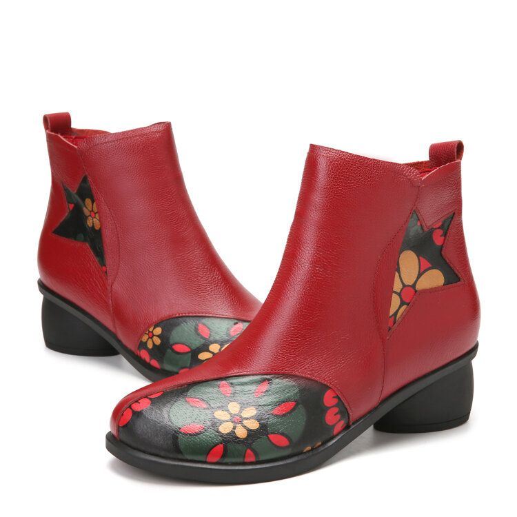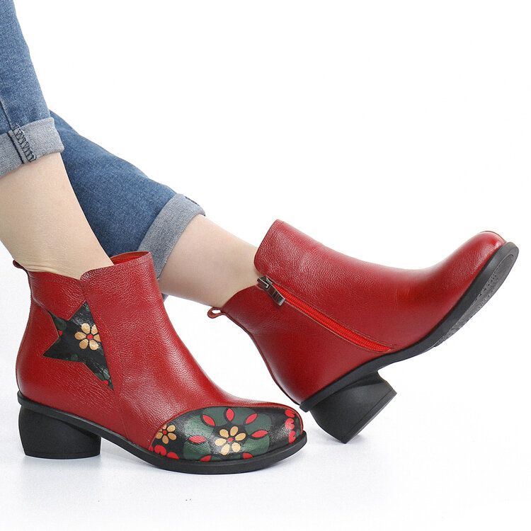 Naisten Tikkaukset Painettu Lehmännahkainen Nahka Lämmin Liukumaton Pehmeä Sivuvetoketju Lyhyet Saappaat