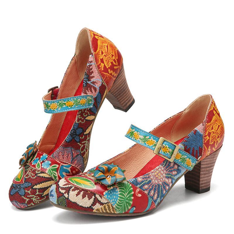 Naisten Tyylikkäät Kukkakoristeet Painettu Tikkaus Kukkakankaalla Koukkusilmukka Liukumaton Mary Jane Paksut Kantapääpumput