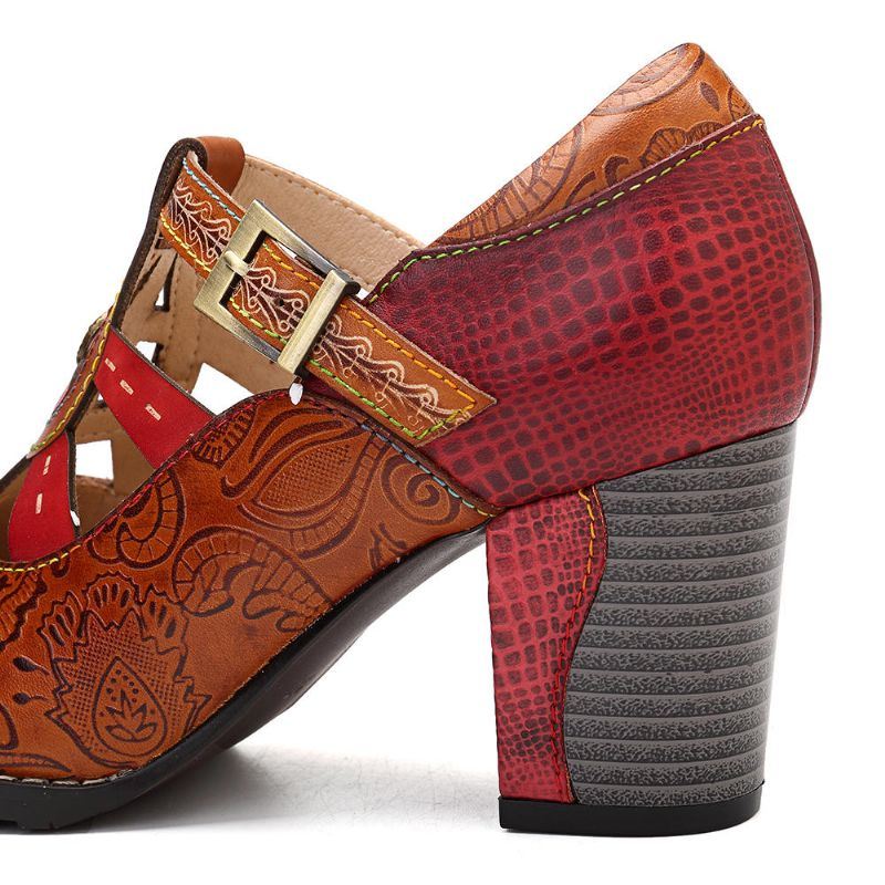 Naisten Vintage Hollow Out Paksut Korkokenkä Nahkapumput