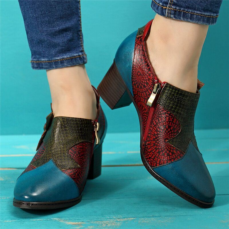 Naisten Vintage-käsinmaalatut Kukkakuvioiset Vetoketjut Keskikorko Aitoa Nahkaa