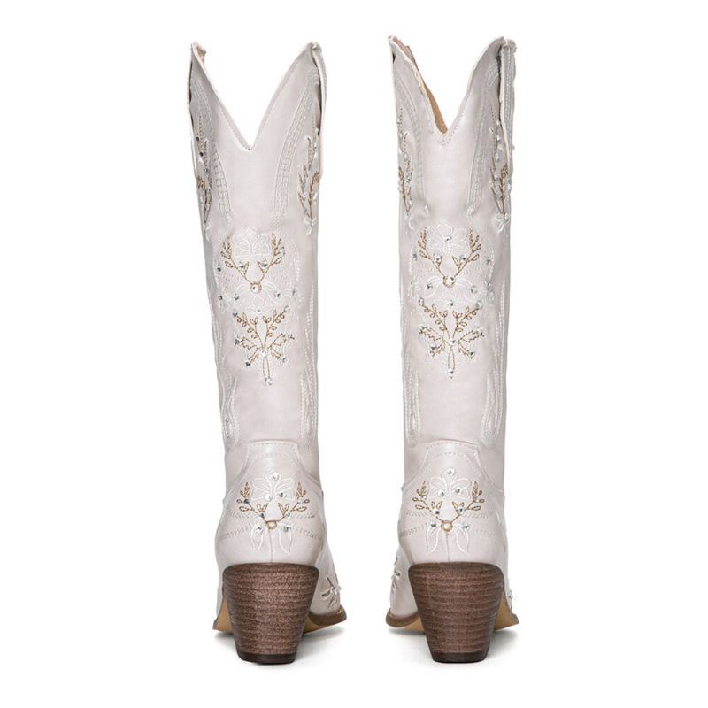 Naisten Yksinkertaiset Kukkakirjontapainoiset Nahkaiset Mukavat Paksut Korkokengät Pohkeen Puolivälissä